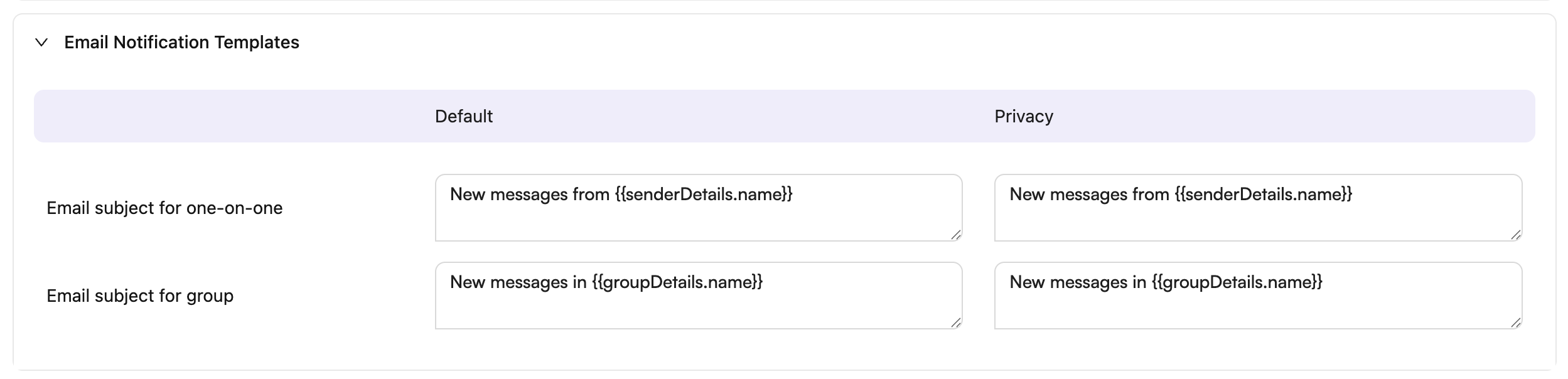 You can use the provided subject field or build your own using senderDetails.name and groupDetails.name. Here are default and privacy-focused subject templates: