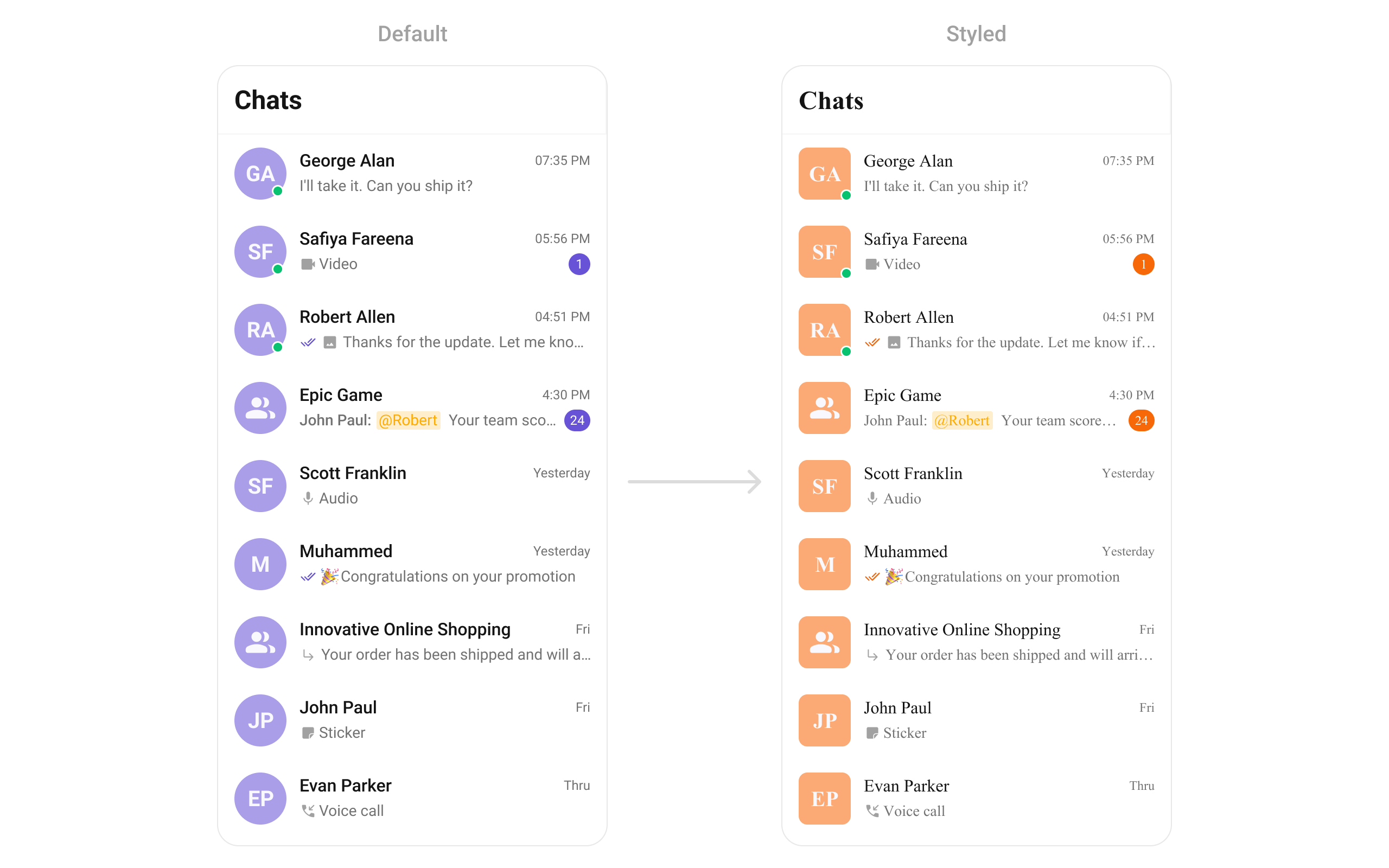 | Base components | Avatar, Badge, StatusIndicator, Receipts, Reactions, ReactionList, MediaRecorder |