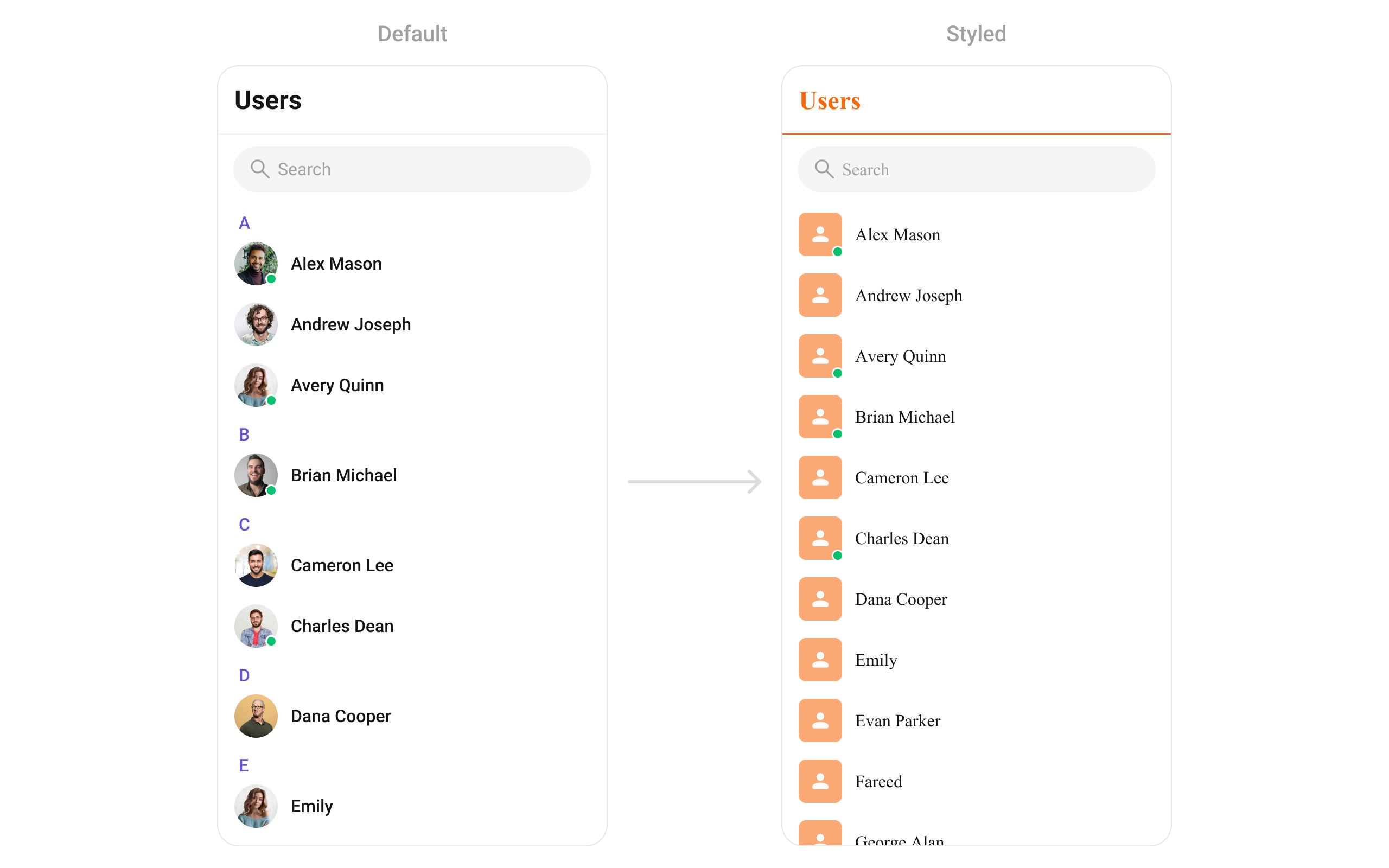 | Pattern | CometChat<Component>Style classes |