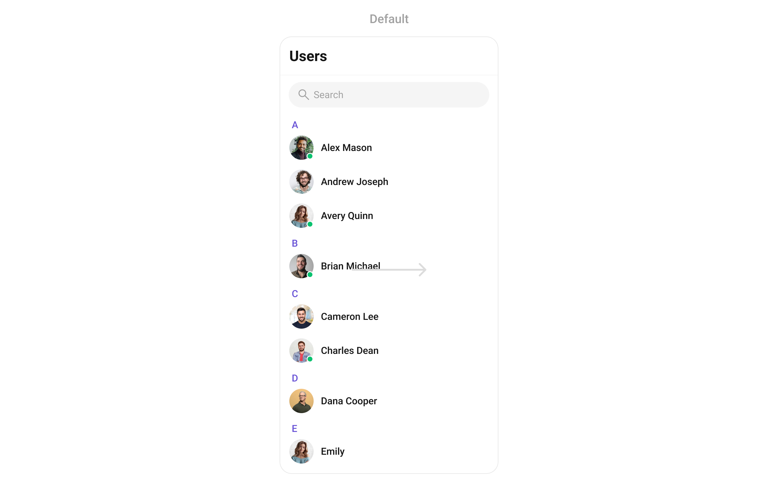 false, alphabetical headers (A, B, C…) are shown to separate users.