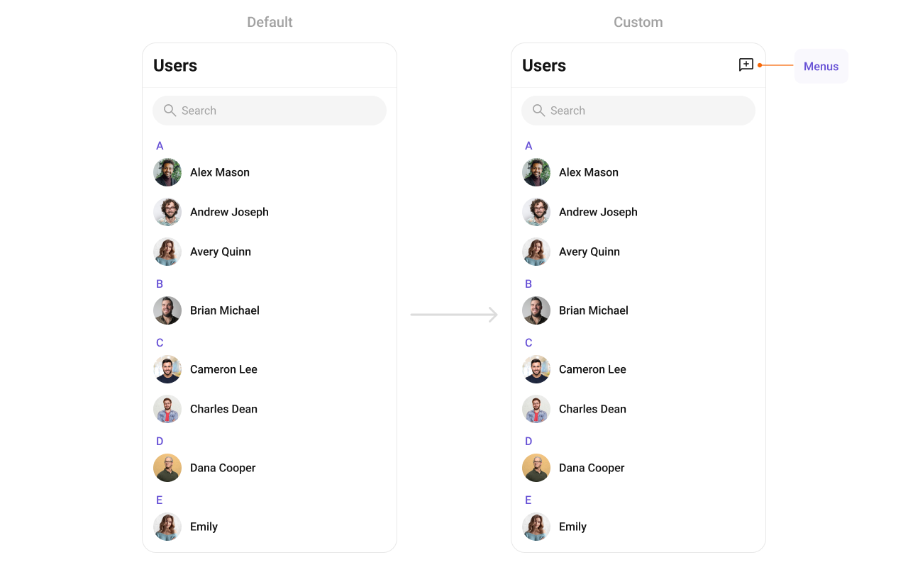 | Replace a section of the list item | Component props | <slot>View render props | listItemView: (user) => CustomWidget() |