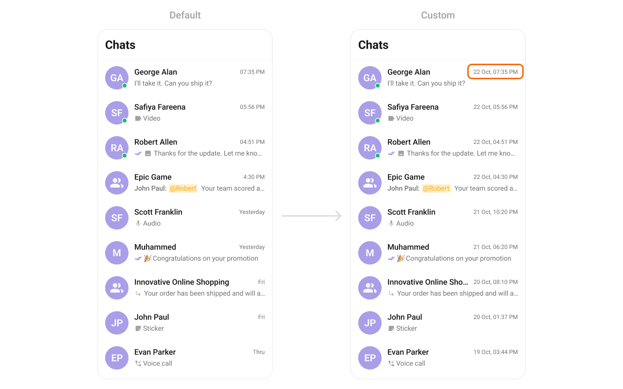 This method customizes the date format used for displaying timestamps in conversations or chat components. Developers can specify formats such as: