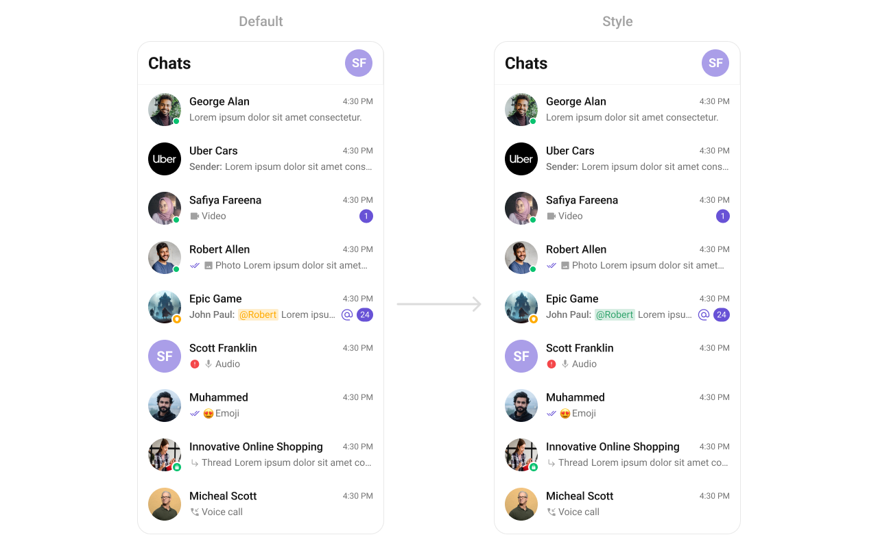 To fit your app’s design requirements, you can customize the appearance of the conversation component. We provide exposed methods that allow you to modify the experience and behavior according to your specific needs.